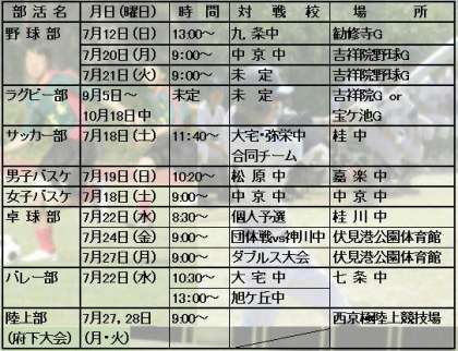 まだ梅雨の真っ盛り、祇園祭もこれからですが、7月12日より野球を皮切りに夏季大会が始まります。3年生にとっては中学校最後の公式戦になります。ぜひ悔いのない試合をしてほしいと願っています。友達・保護者・地域の皆さんも時間の許す限り、応援に駆けつけていただけたら幸いに思います。