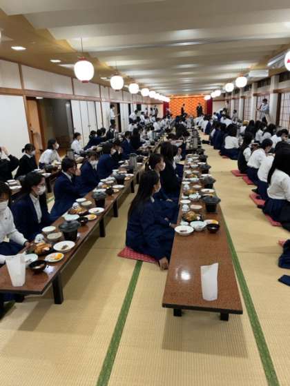 今日の夕食会場は全員が同じ方向に向いての食事です。
