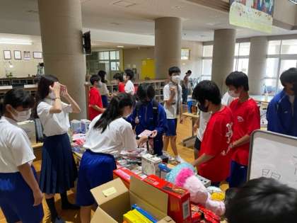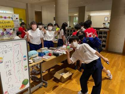 1年生の総合的な学習の時間の取り組みで、SDGs「12 つくる責任 つかう責任」について考えてきました。今日はご家庭で使わなくなったものをもってきていただき、必要な人に使っていただくフリーマーケットを行いました。