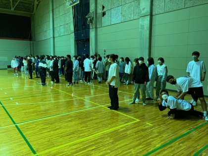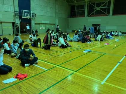 ラフティング、EXアドベンチャーのあと、各ペンションで夕食を摂り、バスで白馬村体育館に移動しました。