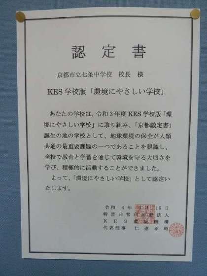 七条中学校がKES「環境にやさしい学校」に認定されました。