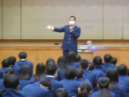 3年生の学年集会がありました。先生の自己紹介で学年主任の先生から、「ウサギとカメ」の話を聞きました。カメがウサギに勝ったのは、それぞれの目的が違ったからだということで、方法は違っても、目的をしっかりもって一年を過ごしてほしいという話がありました。最後に生徒会長から、この学年はよい学年集団なので、来年の3月に、もう一年いっしょにいたいと思ってもらえるようにしますという決意の言葉ありました。