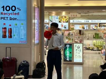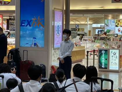 3年生はコンコースに移動し結団式をしました。修学旅行委員からの挨拶のあと、添乗員さん、カメラクルーの紹介をしました。