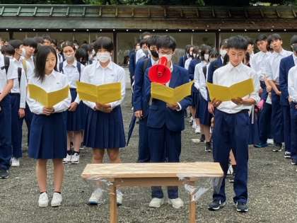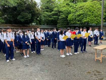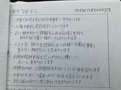 ?靖国神社遊就館に到着し平和セレモニーをしました。みんなで考えた平和宣言を読み、千羽鶴を奉納しました。そして、黙祷をしました。