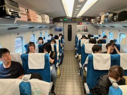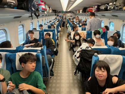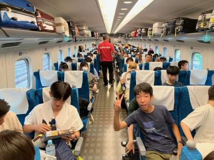 全員元気に新幹線に乗車しました。順調に行けば17:37に京都駅着の予定です。