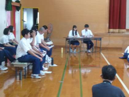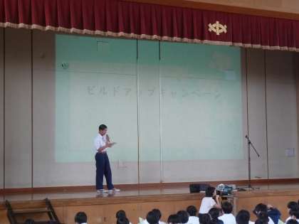 まず、生徒会長から今年の重点取組として、ビルドアップキャンペーンと七中特別キャラクター「サニー」の紹介がありました。