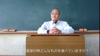 今日の食育放送のテーマは、「風邪をひいた時、なに食べる?」でした。2年の保健安全委員が生徒や先生に「風邪をひいた時に食べるもの」をインタビューし、動画にまとめたものです。定番の「雑炊」「うどん」だけでなく、「餡かけ若玉うどん」「キムチ鍋」「シジミ汁」など、その家独自のメニューがいろいろあり、とても興味深い内容でした。