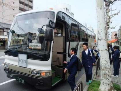 3年生は7時45分に学校に集合し、多目的室で結団式をおこないました。その後、七条通まで歩き、バス3台に分乗し、8時25分に伊丹空港に向けて出発しました。