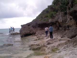 沖縄の海岸、ビーチを歩いて楽しんでいるグループです。