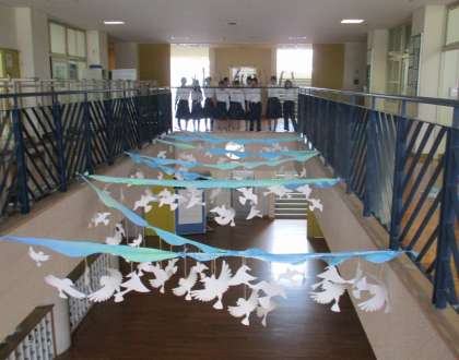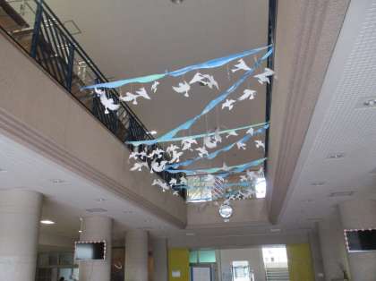 1学期の中頃からコツコツと作った鳥のモビールを、玄関に飾りました。みんなで決めたテーマは「青空〜hope〜」です。ピロティの吹き抜けで涼しげに揺れています。