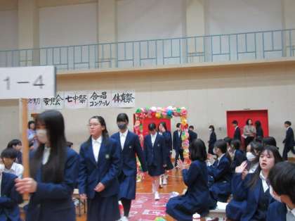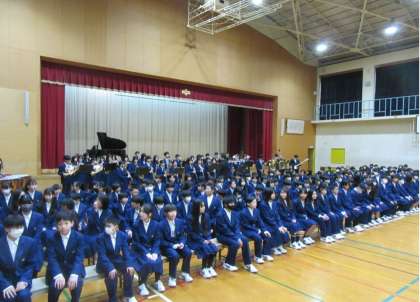 新入生歓迎会が行われました。新入生が入学してから全学年が一堂に会するのは初めてです。1年生は、吹奏楽部の演奏と2・3年生の大きな拍手で入場しました。