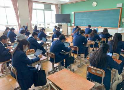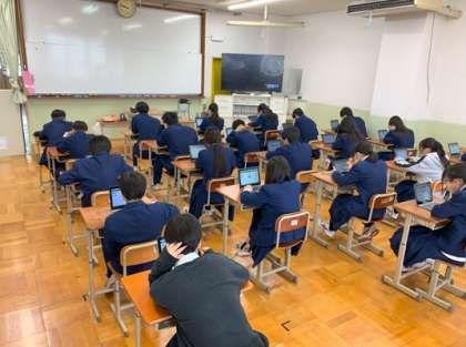 本日は、GIGA端末を使用して、生徒質問紙+操作練習と理科のテストがオンライン方式で行いました。端末を通して問題を解いていくことに、少々戸惑いもありながら、みんな真剣に取り組んでいました。