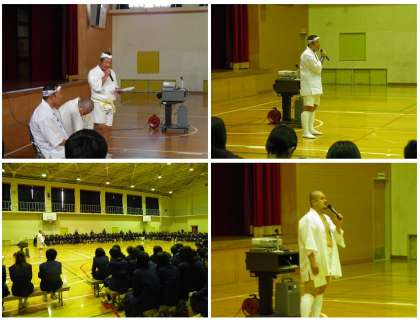 11月27日(火)5,6時間目、七条中学校運営協議会の主催で、地域の祭り松尾大社の「神幸祭(おいで)」「還幸祭(おかえり)」の講演会を実施しました。次の時代を担う生徒の皆さんに地域の行事を知ってもらうという目的で、松尾七社のうち「櫟谷社(いちたにしゃ)」「宗像社(むなかたしゃ)」「四之社(しのしゃ)」の神輿の代表の方々に講演をしていただきました。DVD、実演、体験といろりろ楽しい時間を作っていただきました。特に、「ホイットーホイット」の掛け声とともに鳴閂(なりかん)の体験は、生徒のみなさんにとっては、とても興味深いものでした。「シャンシャン」と鳴る音は、雅(みやび)なもので歴史を感じるものでした。
