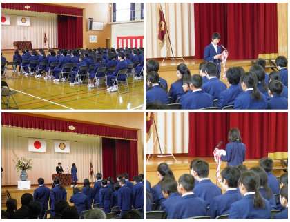 4月9日(火)午前10時、第57回 七条中学校「入学式」が行われました。今日、136名の新しい七中生が誕生しました。桜の花は早く咲いてしまいましたが、新入生のみなさんは、たくさんの保護者の方々に見守られて、中学生の第一歩をスタートしました。入学おめでとうございます。がんばろう 一年生!