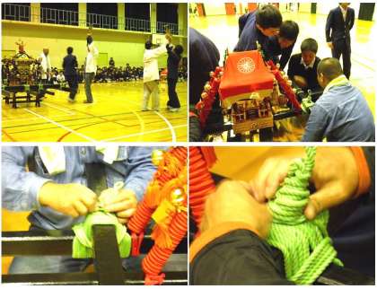 11月26日(火)5,6時間目、七条中学校運営協議会の主催で、昨年は地域の祭り松尾大社の「神幸祭(おいで)」「還幸祭(おかえり)」の講演会を実施しました。今年は、次の時代を担う生徒の皆さんに地域の行事を知ってもらうという目的で、神輿を担ぐ疑似体験を通して、その祭礼に携わる方々の思いを感じ地域に暮らすことへの自覚を深めることを目的としました。地域におられるI様はじめ5名の方に協力をしていただきました。総合司会を運営協議会のF様にお願いして、DVD、体験といろりろ楽しい時間を作っていただきました。特に、「ホイットーホイット」の掛け声とともに鳴閂(なりかん)の体験や、クラス単位の神輿を担ぐ疑似体験は、生徒のみなさんにとって興味深いものでした。