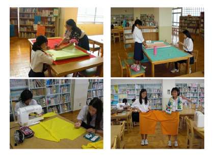 夏休みに入った7月22・23日の2日間、ハンドメイク部が七中祭体育の部の新種目『デカパン競走』のデカパンを製作しました。12色のカラフルな布を使って、裁断・ミシン・装飾をして個性あふれるデカパンに仕上げてくれました。