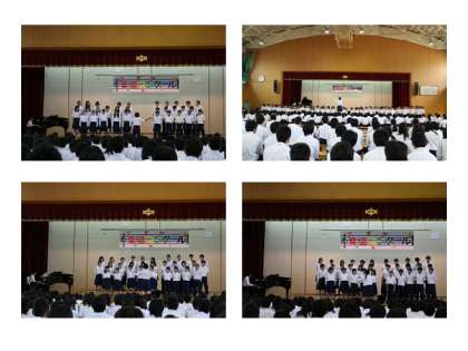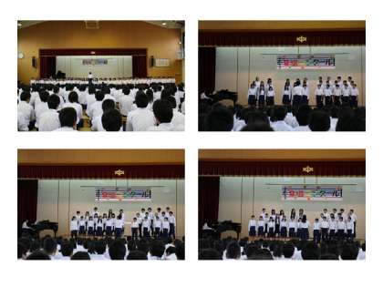 本日、午後から体育館で合唱コンクール課題曲の部をおこないました。1年生は音を響かせる歌声で合唱していました。しかしながら、さすが2年生。ぐっとレベルが上がりました。学年合唱では歌い終わった後に、体育館に響きがしばらく残りました。これにとどまらず、やっぱり3年生。上級生のプライドをしっかりと示してくれましたね。素晴らしい合唱でした。