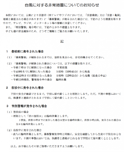 台風18号が近畿地方に接近しています。暴風警報等が発令された場合の対応をお願いします。