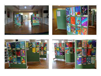 現在、ピロティに作品を展示しております。すでに、懇談に来られた保護者の皆様にはご覧いただけたかと思いますが、これからお越しの皆様にも鑑賞いただければ幸いです。