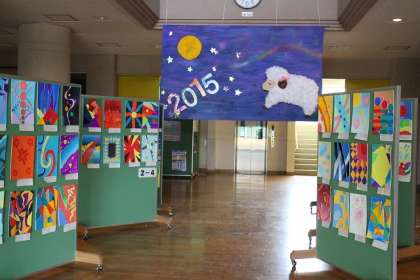 ピロティには写真のように、大きなひつじの絵を飾っています。これは年末に、美術部とハンドメイク部が準備してくれました。新しい年を祝う素敵な作品です。