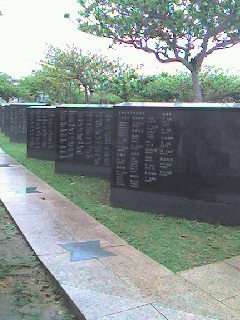 あいにくの雨ですが、平和記念公園に来ています。「平和の礎」の前にいます