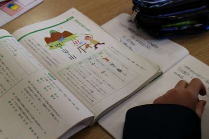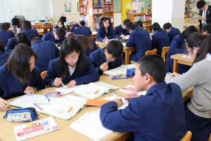 今、1年生の国語では「漢字の成り立ち」という学習をしています。図書室には漢字辞典を置いていますので、図書室を活用して授業をおこなっています。