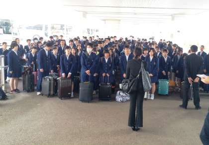伊丹空港に到着し、搭乗手続の説明を真剣に聞いています。