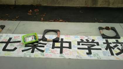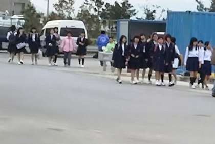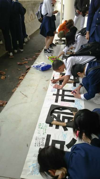 子どもたちが伊江島港に集まってきました。そして、お世話になった方への寄せ書きをしています。