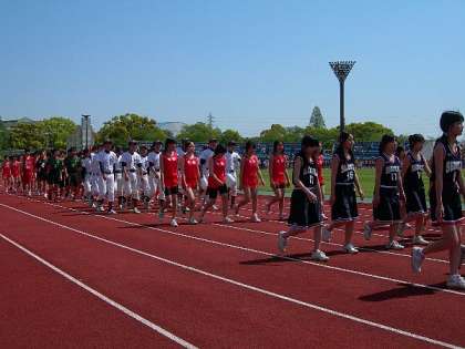 4月29日(木)西京極運動公園は、朝からの雨で中止も検討されましたが、午前9時50分予定通り春季総合体育大会の開会式行進が始まりました。七条中学校83名は、練習通りの堂々の行進をしていました。天候も開始時には晴天になり、風が吹いてさわやかな行進となりました。選手のみなさん、ご苦労様でした。