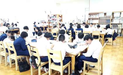 写真は、図書室いっぱいに集まった1年生の様子です。