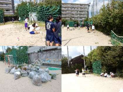 グランドの周囲に生えている草を抜いたりや低木の伸びた