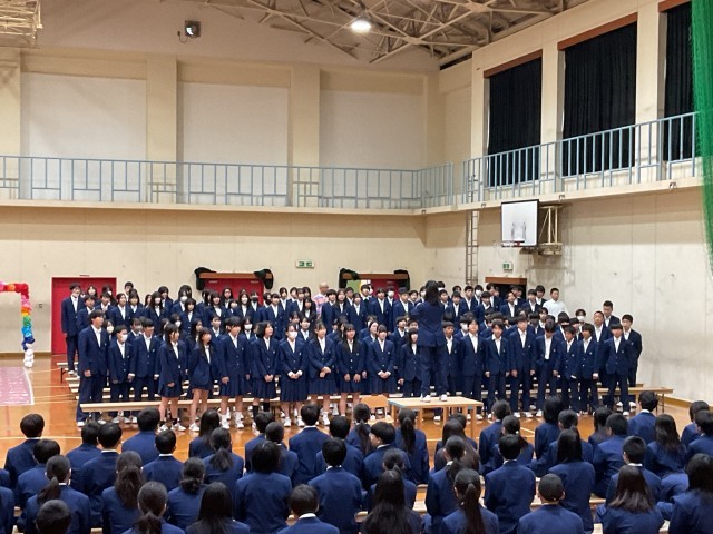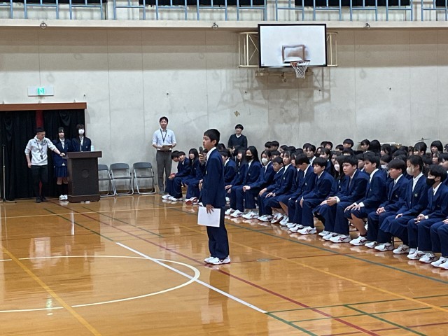 体育館にて新入生歓迎会を行いました。先輩からの紹介や発表があり、