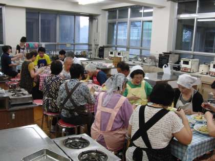 メニューは冷やし中華・シュウマイ・バナナケーキです。グループに分かれて、料理にかかります。ひとりひとりの素早い動きと手際の良さは本当にお見事です。あっという間に、色とりどりのおいしそうな料理がテーブルに並べられていきます。