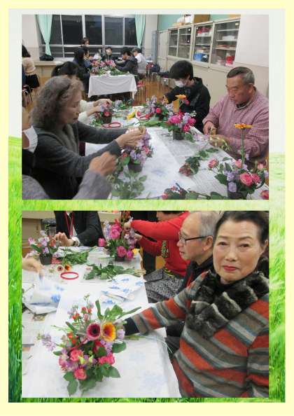 毎年、年末恒例のフラワーアレンジメントを「蓮井乗花園」から4名の先生にお越しいただいて、教えていただきました。