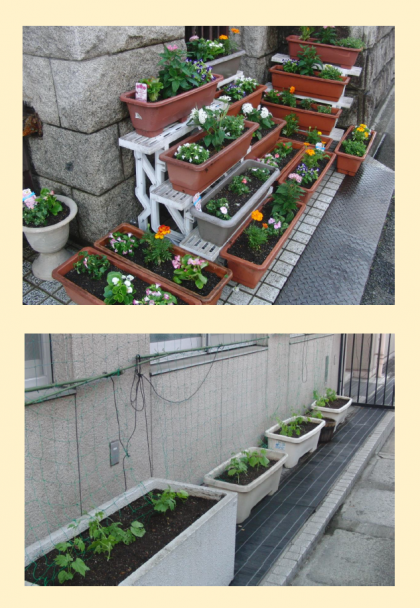 学校の校門を美しく彩る,夏の花。緑のカーテンにもなる,ゴーヤ。秋の焼きいもパーティーが待ち遠しい,さつまいも。グループに分かれて,花や野菜の苗を植えました。