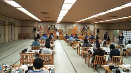 みんなで晩ごはんです。海の幸・山の幸満載のメニューです。どれもおいしそう!手を合わせていただきます!!