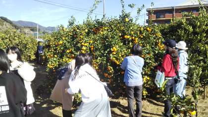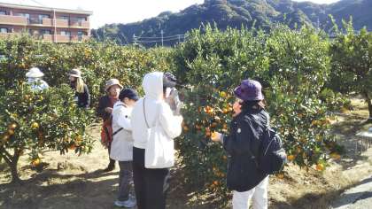スガイ農園にて、ミカン真っ盛り…いやいや、ミカン狩り真っ盛りという感じで、みんなで採りたてのミカンを頬張っています。