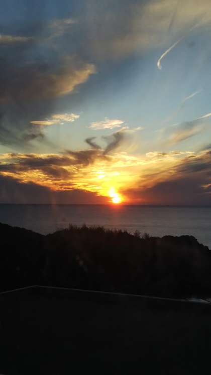 ホテルのお部屋でのショットです。オーシャンビューのお部屋からは、夕日が一望できました。明日も(いえ、もう日付は変わっていますね)、とても良い天気になりそうです。そして、この夕日の様子は、いいことありそうな予感を抱かせてくれます。