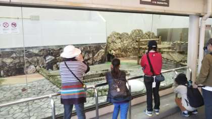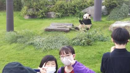 パンダが可愛すぎて、どうしても見入ってしまいます。でもさすがに、アドベンチャワールド内で不動の人気を誇るパンダたちは、大人気でたくさんの人だかりです。そんなパンダを前に、記念写真をパチリ。