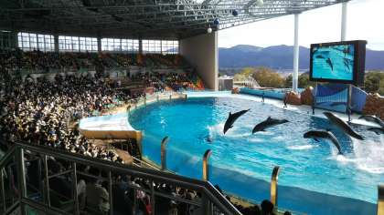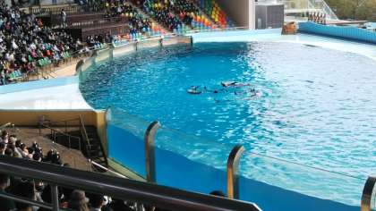 マリンライブ「Smiles」というイルカショーを見ています。バンドウイルカ、カマイルカ等のイルカたちと、トレーナーさんが大迫力のパフォーマンスを見せてくれます。
