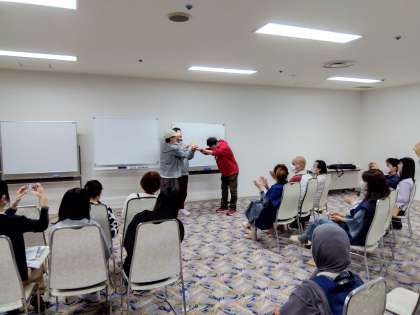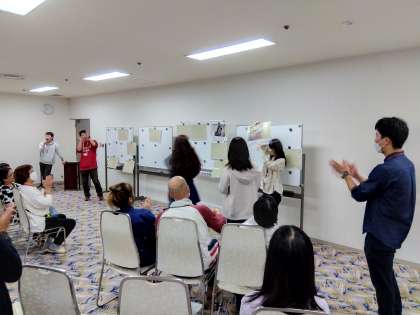 修学旅行恒例の、交流グループ対抗マッチングゲームです。教職員の秘蔵(?)写真と今の写真を組み合わせていくゲームです。写真の面影から、すぐに誰かわかる方、「???」となかなか想像の及ばない方、会場は大盛り上がりです。楽しいひと時です。