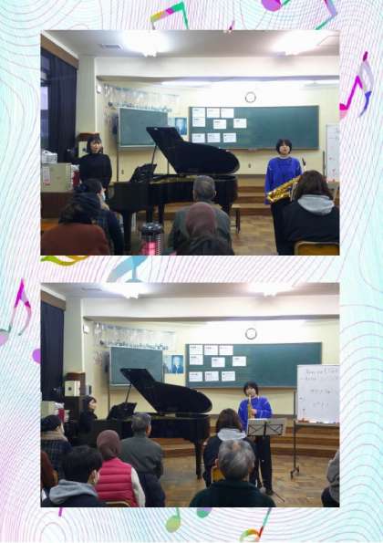 京都コンサートホールから、福田彩乃さん(サクソフォン)、曽我部智花さん(ピアノ)にお越しいただき、アウトリーチコンサートを開きました。