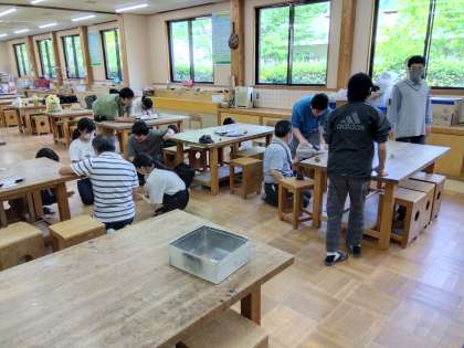 それぞれに、コマができ上がりました。できたコマを回しています。床が回りやすいのか、それともテーブルの上がよくすべって回りやすいのか…。いろいろと試行錯誤しながらの、コマ回しです。