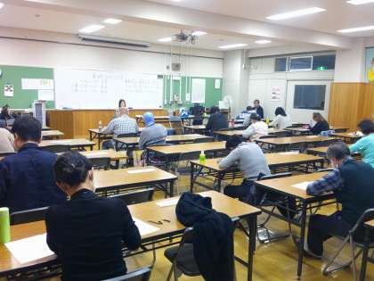 夜間部は洛友サロンに集まってテストを受けました。みなさん真剣そのもの、教室はしんと静まり返っていました。