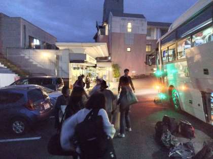 まずは本日から明日、お世話になるホテルの皆さんにご挨拶です。その後は、お風呂で疲れを癒したり、部屋でほっこりと落ち着いたり…。19時から、全員で夕食です。