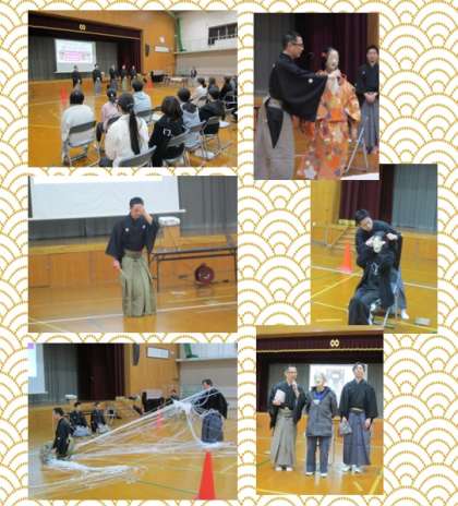 今日は、12月に実施する文化体験「能・狂言」鑑賞会の事前学習ということで、本公演で演じて頂く「金剛会」さんにお越し頂き、ワークショップをして頂きました。