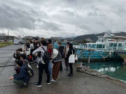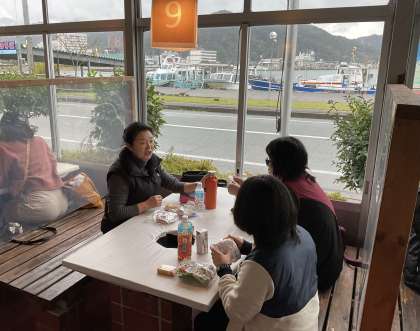 若狭フィッシャーマンズワーフに到着した後に、かき小屋をお借りしてみんなで昼食を食べました。雨はほとんど降っていません。乗船する船の前で記念写真を撮りました。