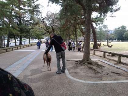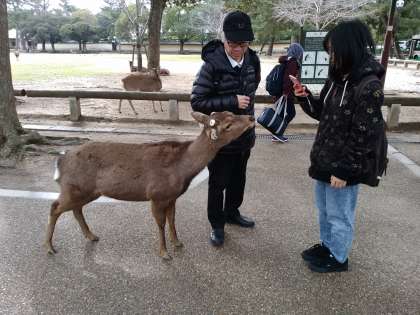 昼間部生徒が、奈良国立博物館に到着し、展示品を鑑賞しました。また、青銅器館も見学しました。その後、興福寺周辺を散策しています。写真は、奈良国立博物館前と興福寺周辺散策で「しか」とふれ合っている様子です。