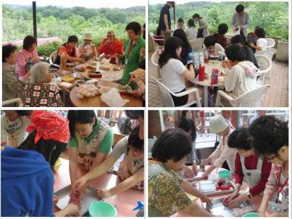 次に,伊賀の里「モクモク手づくりファーム」で、手づくりウインナーにチャレンジしました。説明を聞いた後、豚肉を混ぜ合わせ、調味料や水を加えてウインナーのもとをつくりました。そして、器具を使って羊の腸の中に先程つくったウインナーのもとを、二人一組になって詰めていきました。その後、食べやすい大きさに腸をねじってトレーにのせ、80度で20分か蒸して手づくりウインナーが完成しました。