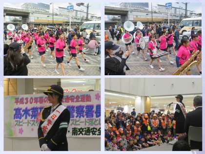 この日は,スピードスケート金メダリスト高木菜那選手を,南警察署の一日警察署長に迎えてイベントが行われました。吹奏楽部はパレードで演奏し京都駅前を行進して,交通安全のアピールに協力しました。土曜日の駅前ですので観光客も多く注目される中,見事な演奏を行ってくれました。
